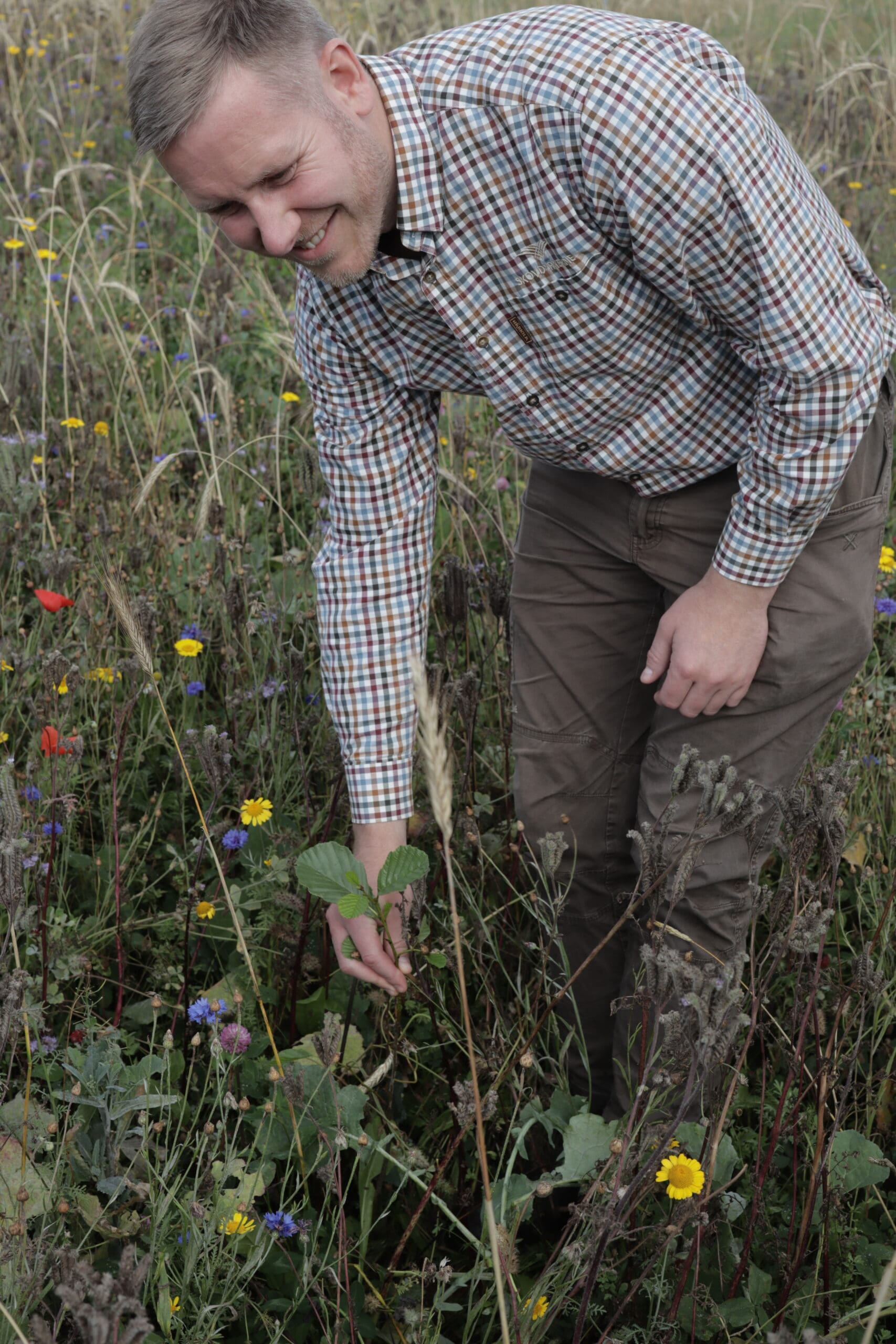 Skovfoged Thomas Nygaard Kristensen lister rundt i noget, der mest ligner en blomster-brakmark. Men marken er en skovrejsning ved Horsens, som gennem hele sæsonen har været begravet i et hav af urter og blomster.
