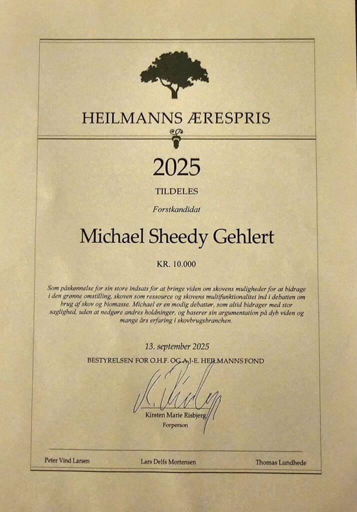 Skovdyrkernes skovbrugsdirektør, Michael Sheedy Gehlert, har modtaget Heilmanns Ærespris.