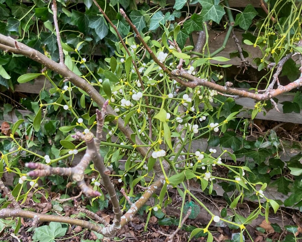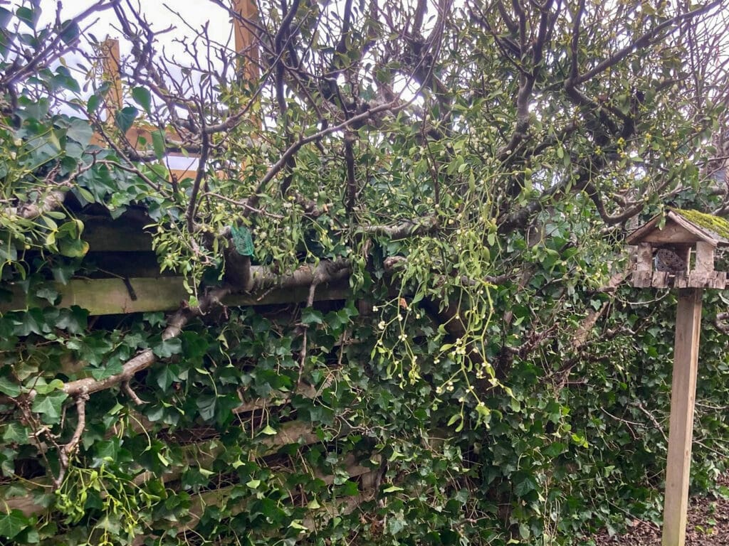 Her ses et gammelt espalieret æbletræ, der er kraftigt angrebet af mistelten. For 23 år siden blev to planter sået på træet – en han og en hun. Siden har fuglene spredt frøene videre, og træet er i dag tæt besat. Det er noget medtaget, men giver stadig æbler.